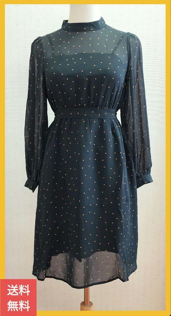 - 【送料無料】ドット 透け防止インナーとリボン付きのワンピース グリーン 長袖 XS