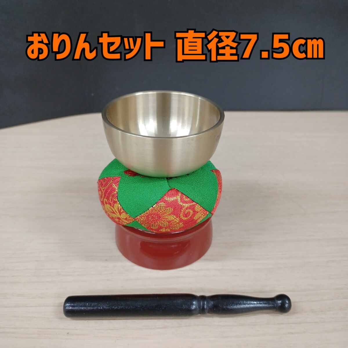 > 石) ②おりんセット 直径7.5㎝ おりん りん棒 りん台 りん布団 緑/ゴールド 真鍮 仏壇 仏具 寺院仏具 法事 4点セット 240827 F1-2