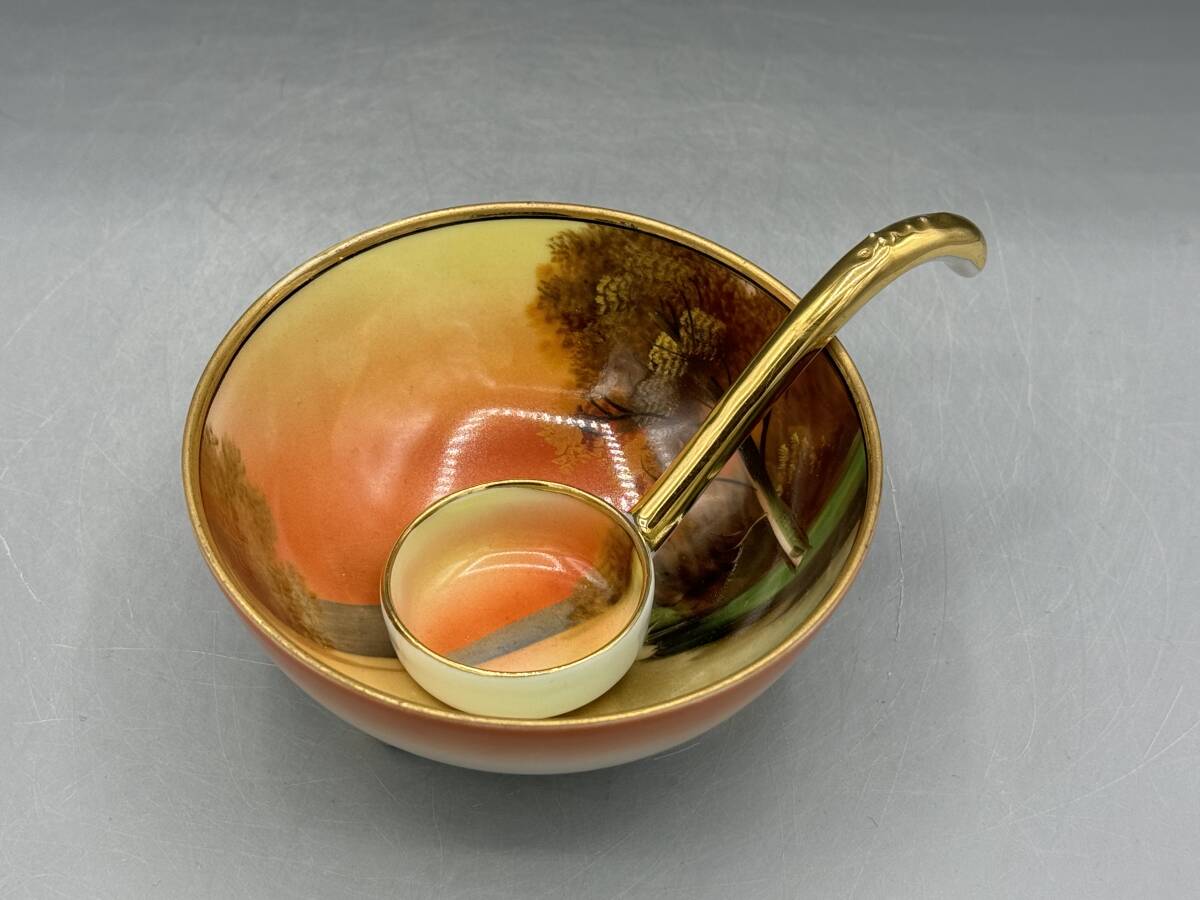 > 里帰り ノリタケ M-JAPAN印 三つ足 ボウル 器 スプーン 金彩 夕焼湖畔風景図 M印 (785)