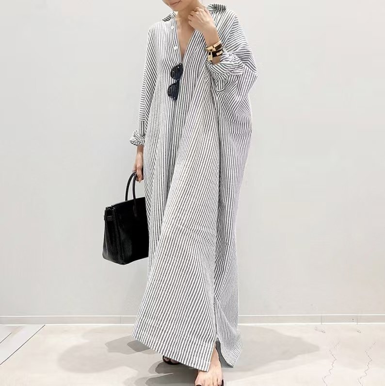 - LRM3516★新品フリーサイズ秋 カジュアル 大きいサイズ コットンリネン ゆったり ボーダー柄 20代30代40代 長袖 マキシロングワンピース