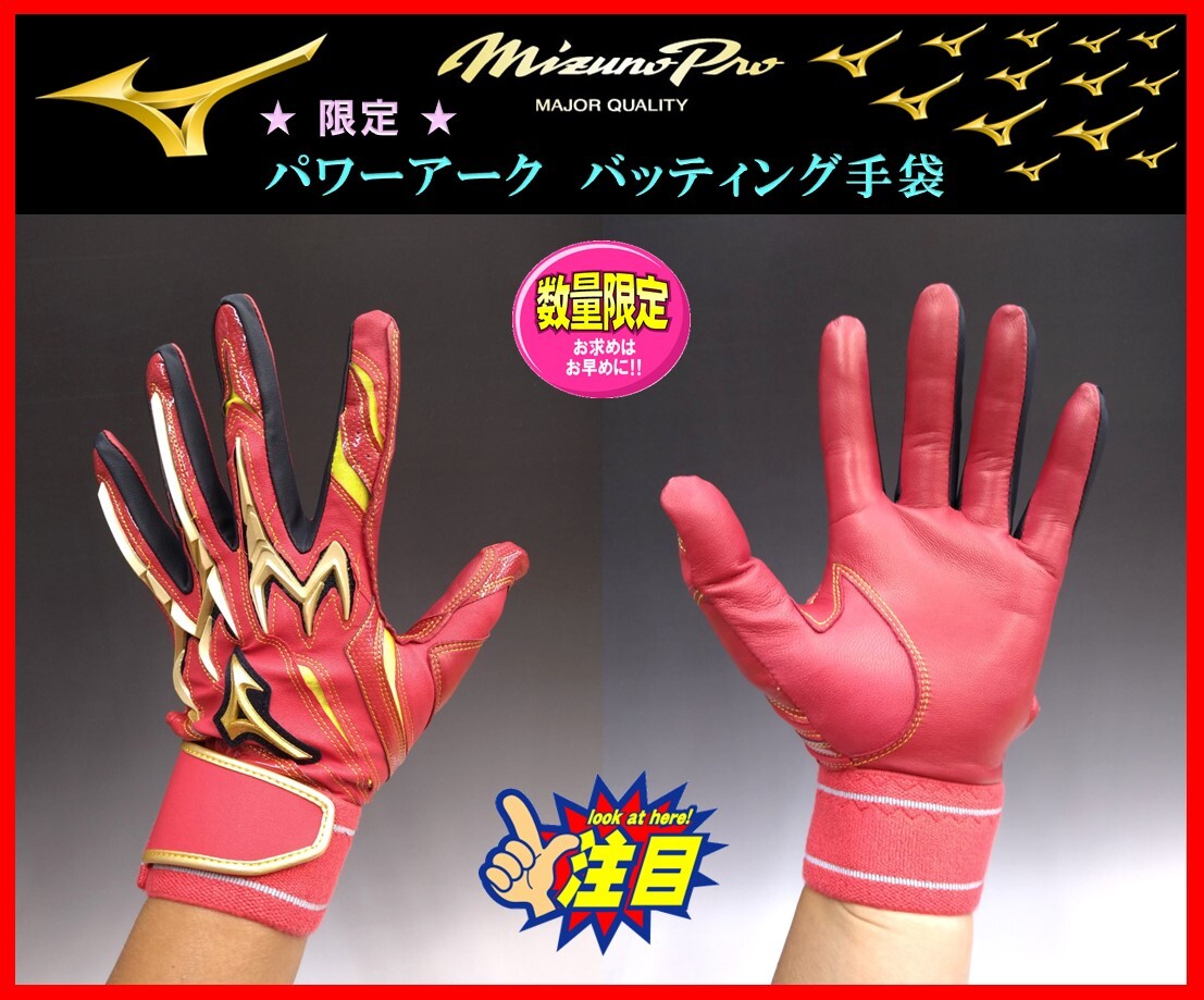 > ◆送料&刺繍無料◆ 25cm ミズノプロ バッティング 手袋 グラブ 1EJEA53762 赤×金×黄 両手組 パワーアーク 型押しなし 天然皮革
