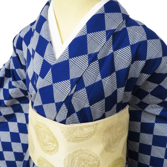 - 播包 新品 播州織 着物 木綿 単衣 カジュアル 格子模様 チェック柄 反端付き 紺色 身丈168cm 裄69cm L トール きもの北條 A1086-4