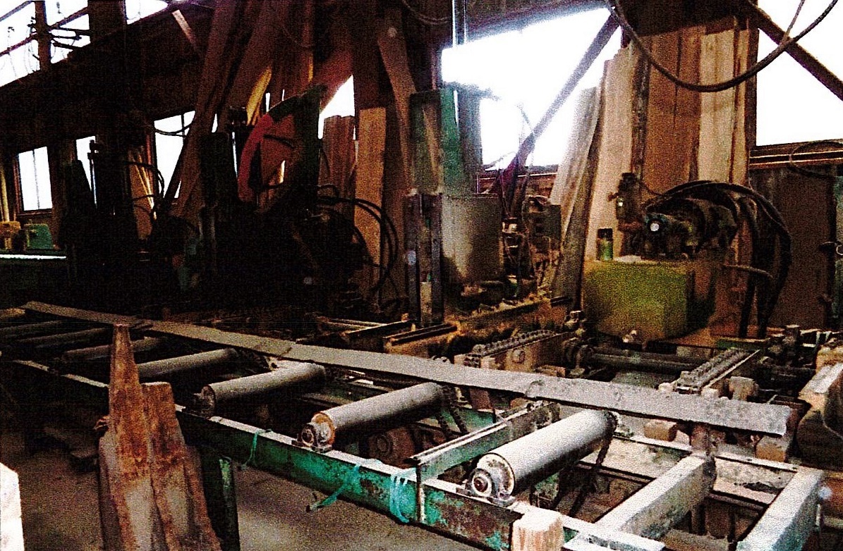 > c3A【山形イイ長051022-2ミ】製材機1100型 マスト4本 木廻し付 油圧カスガイ 900型デジタル歩出機 石田 原木盤台付