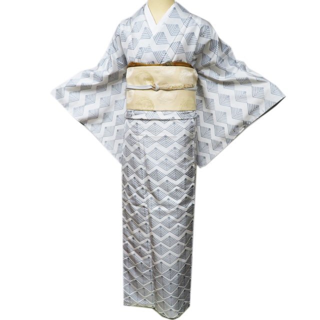 - 特選 本場 大島紬 着物 未使用 正絹 袷 ラベル付き 佐伯武晴 落款 松菱模様 灰白色 黒色 身丈172cm 裄64.5cm L トール きもの北條 A1090-6