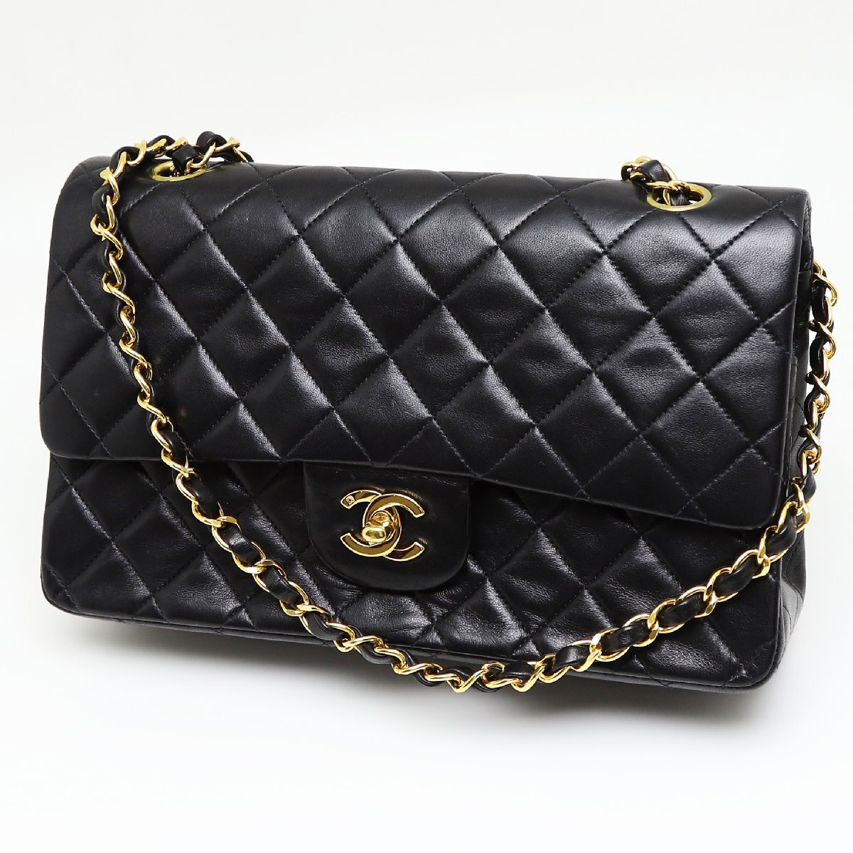 - 中古品 シャネル マトラッセ25 Wフラップ チェーン ショルダーバッグ ラムスキン ブラック ゴールド金具 A01112
