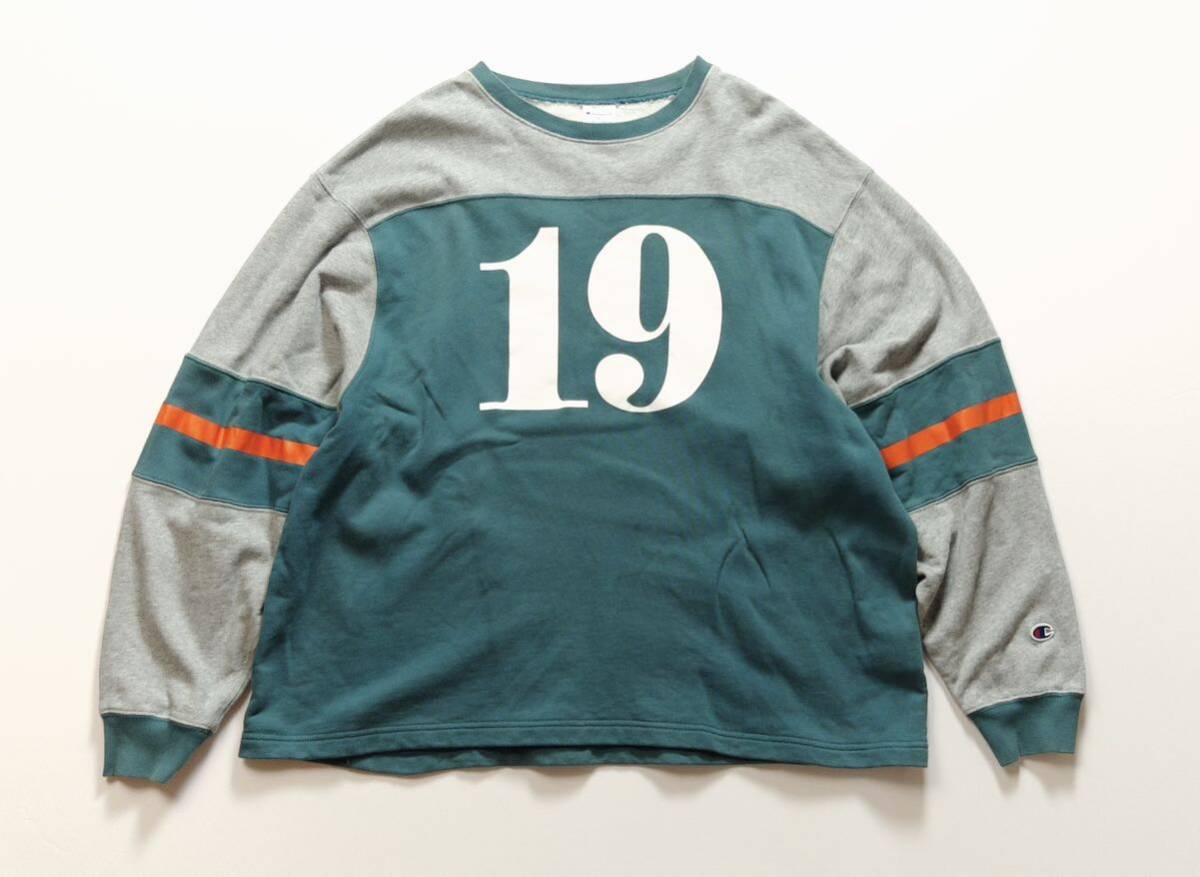 - 【XL】Champion フットボール クルーネック スウェット 袖ライン ナンバリング グリーン×オレンジ
