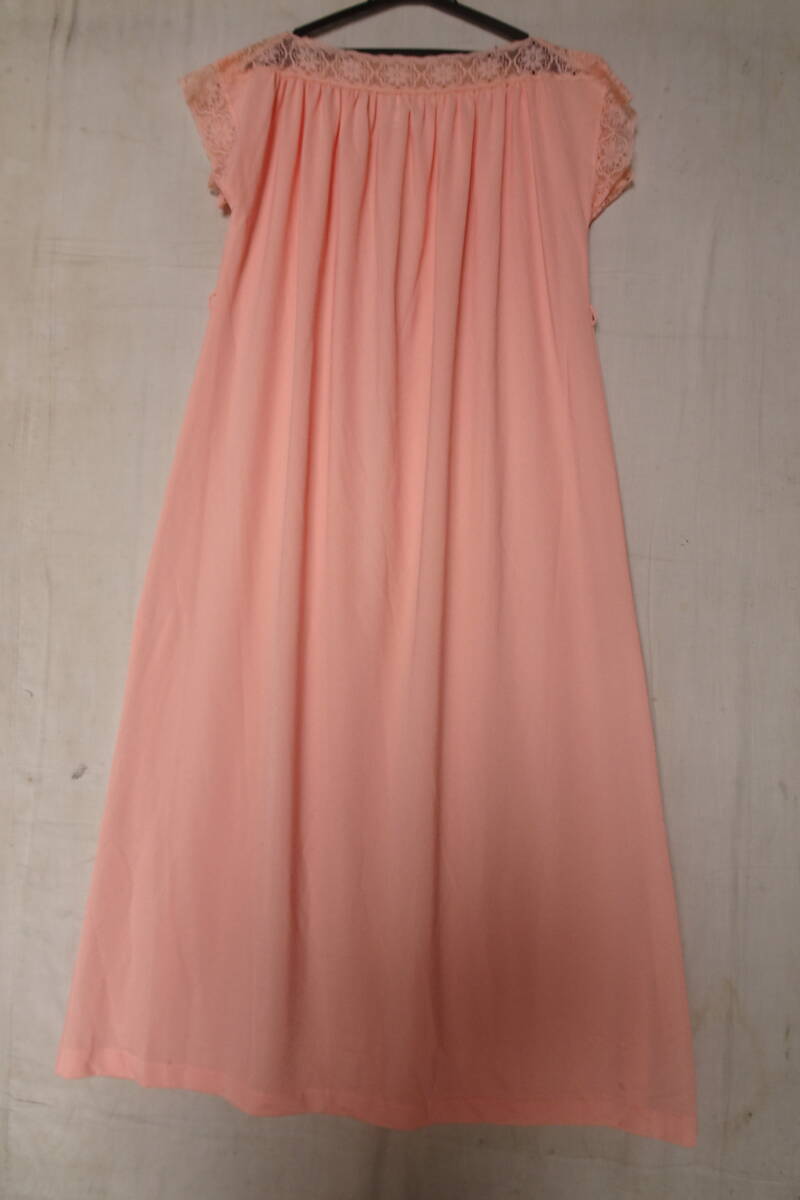 - 四季舞 by ORIGAN/ネグリジェ/ナイトウェア/半袖フレアーロング丈ワンピース/首ぐり・袖口レース/サーモンピンク/Mサイズ(9/30R)