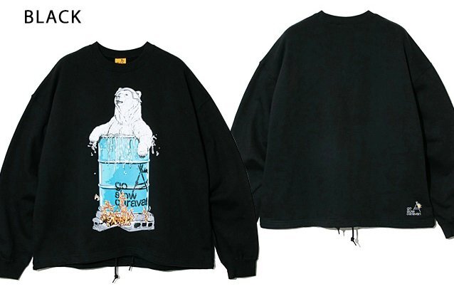 > 空紡糸裏毛 ドラム缶風呂クマ ヘムスピンドルBOXクルースウェット◆go slow caravan ブラックLサイズ 332610 ゴースローキャラバン 熊 ト