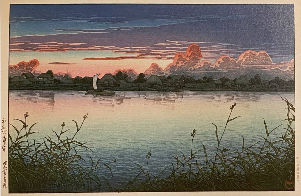 - 川瀬巴水、〈初秋の浦安〉、希少画集画、高級新品額・額装付、状態良好、送料込み
