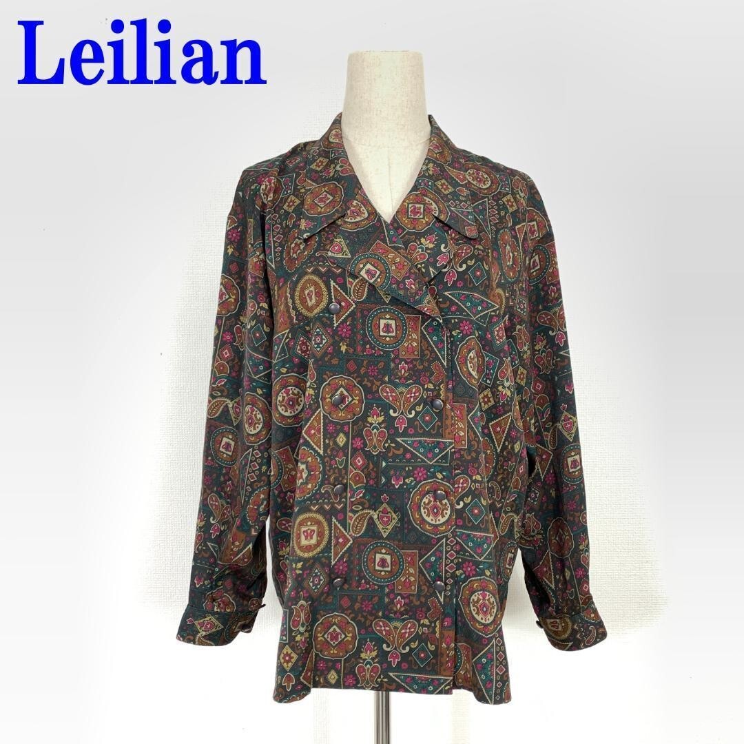 - レリアン 長袖ブラウス シャツ 総柄 ダブルフェイスLeilian グリーン モスグリーンボタン 緑系 9 C1466