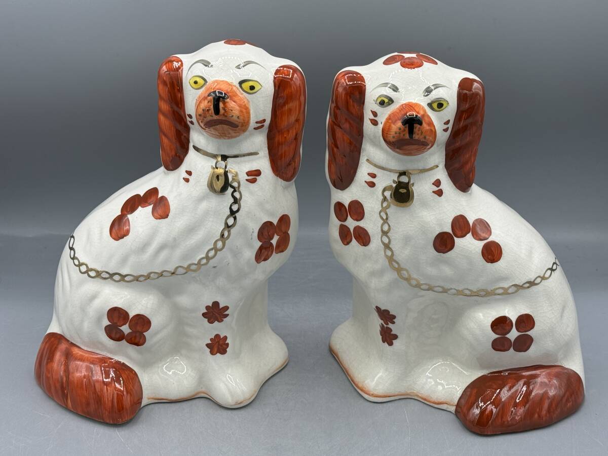 - 英国 スタッフォードシャー ドッグ 犬 ペア 朱白 陶器 ビンテージ マントルピース