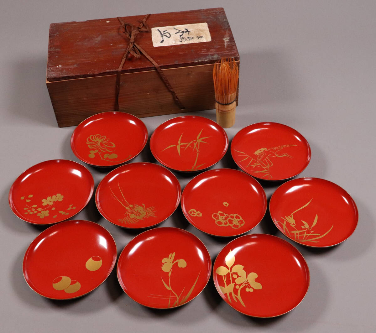 - 漆芸 木製漆器 絵変 金蒔絵 朱塗 木皿 引き盃 十客 木箱入り 小皿【MA179】