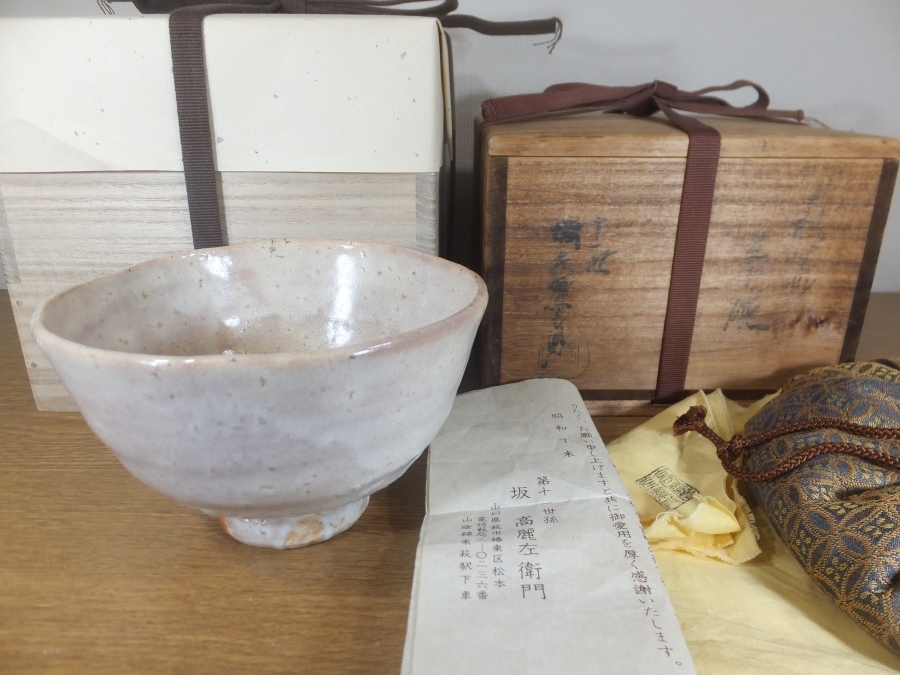 > ◎【真作保証】 11代 坂高麗左衛門 自作 萩焼茶碗 二重箱 旧毛利藩御抱窯 県指定無形文化財 一水会正会員 日本工芸会正会員 茶道具 山口県