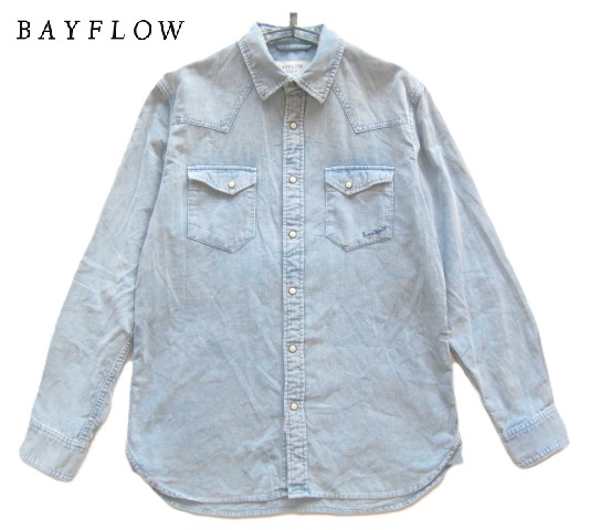 > 美品!!ベイフロー BAYFLOW*硫化染料染め加工 コンチョボタン付きダブルポケット細畝コーデュロイシャツ 2 実寸S 水色 OLD SURF