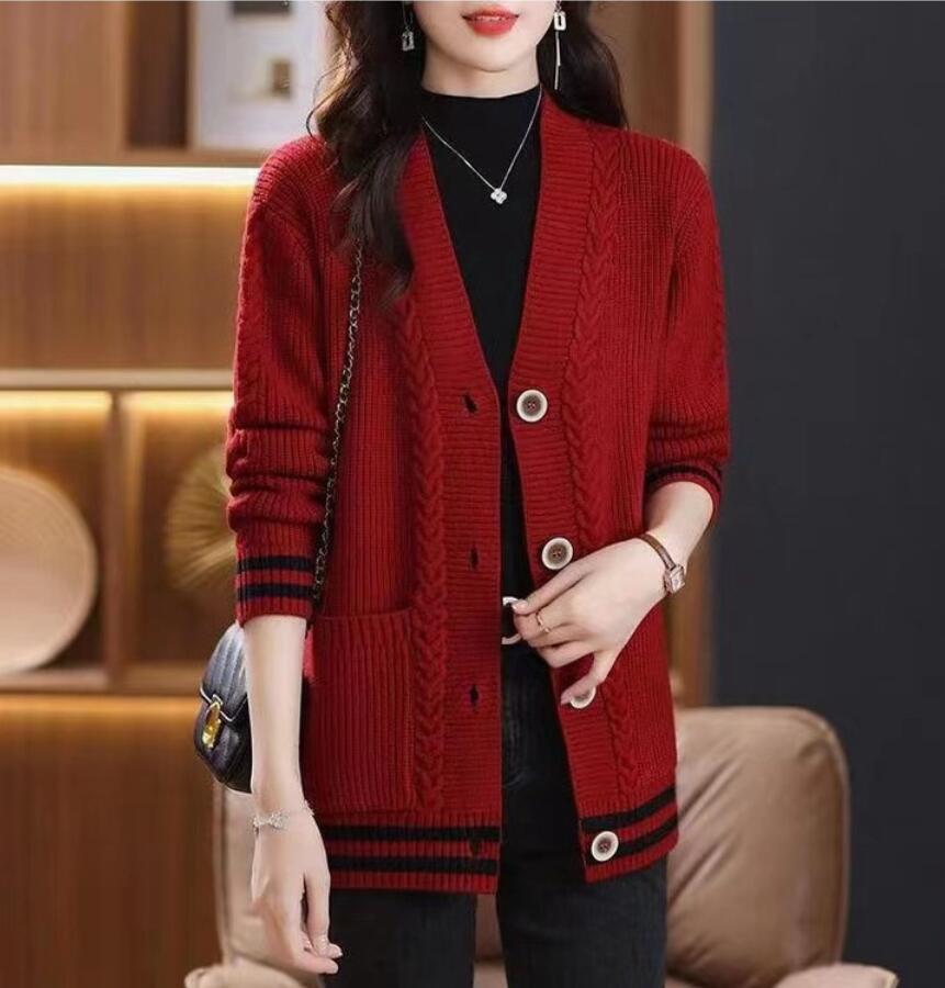 - 秋冬美品*レディース ニット カーディガン 長袖 厚手 ニット 前開き アウター 羽織 トップス キレイめ 仕事 オフィス ゆったり*赤
