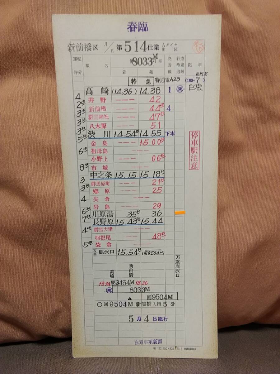 - 運転士時刻表 スタフ 新前橋電車区 第514仕業 8033M 高崎ー万座・鹿沢口 183系7両 特急白根 田町電車区 国鉄 日本国有鉄道 高崎線 吾妻線
