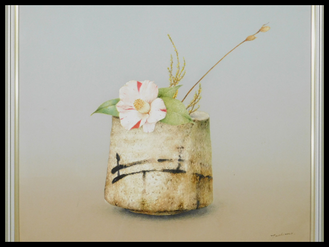 > 戸嶋但 橋姫(志野焼茶碗と椿 静物画)F8号 油彩(油絵)キャンバス 額装 秋田県生 文部大臣賞 百貨店取扱 リアリズム 写実 極細密 s24033105