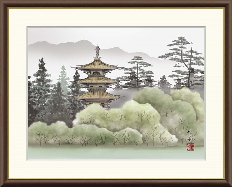 - 高精細デジタル額装版画 現代日本画 山水画 富士山、塔景 「 幽山塔景 」 サイズ F8号