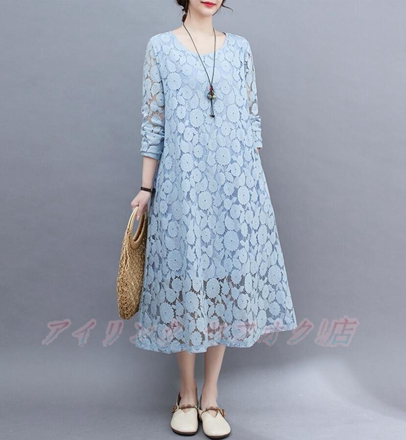 > ☆新品サイズ選択可 レースワンピ ロングワンピース レディース 総レース 可愛い長袖 森ガール 体型カバー 膝下綿混 ブルー