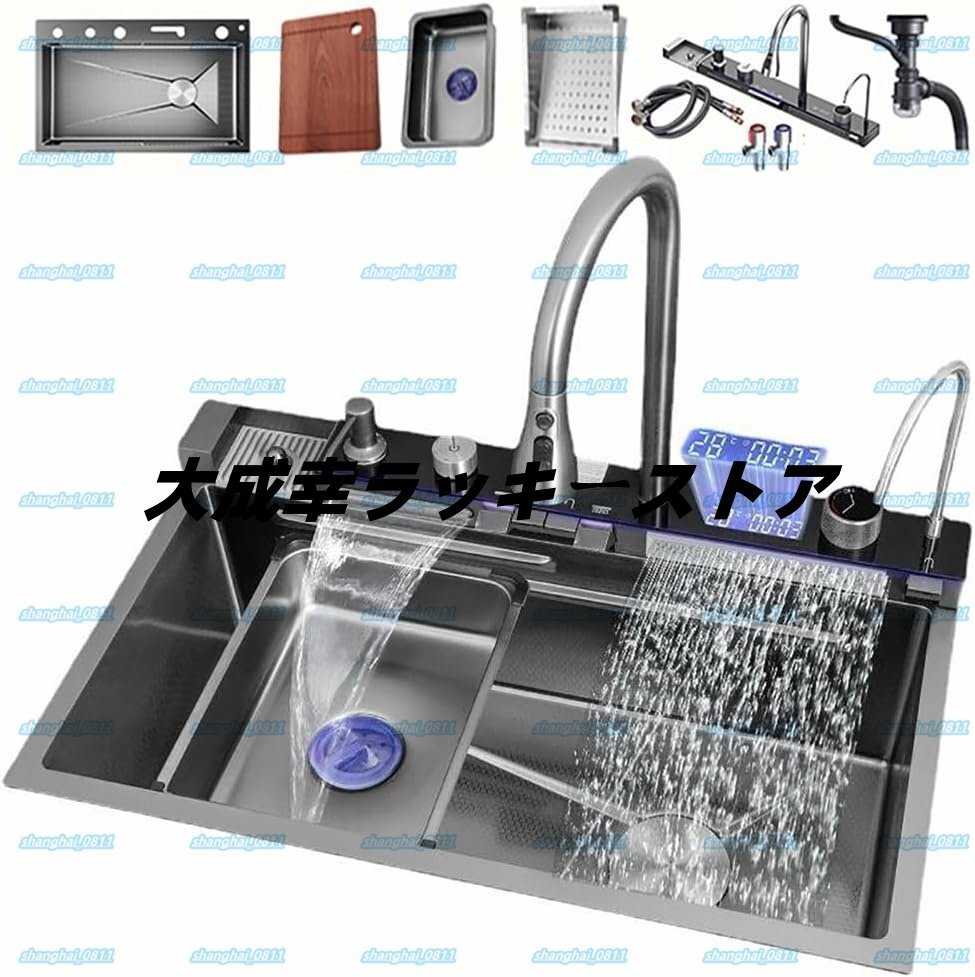 - キッチンシンクスマートウォーターフォールシンク引き出し式蛇口付き 台所ステンレスシンク大きい流し台 80x45x22cm