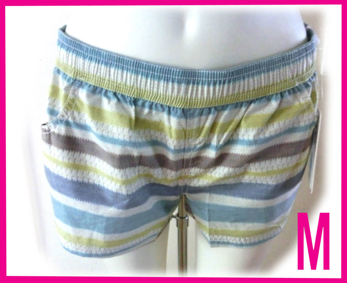 > 18 ブルーグリーン?ボーダー 新品 100002 RUSTY ラスティ 短パン レディース サーフパンツ ボードショーツ M 水着 ラッシュガードパンツ