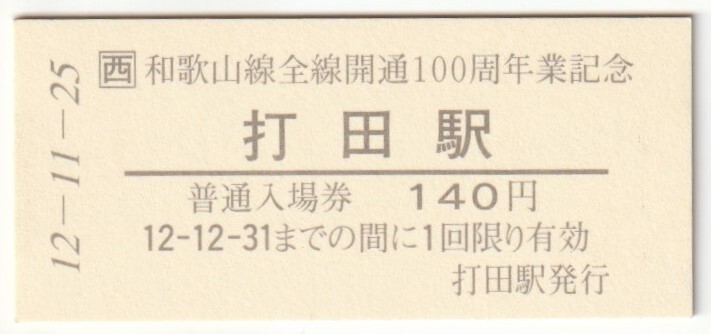 - 平成12年11月25日 和歌山線 打田駅 140円硬券普通入場券(和歌山線全線開通100周年業記念・日付印刷)