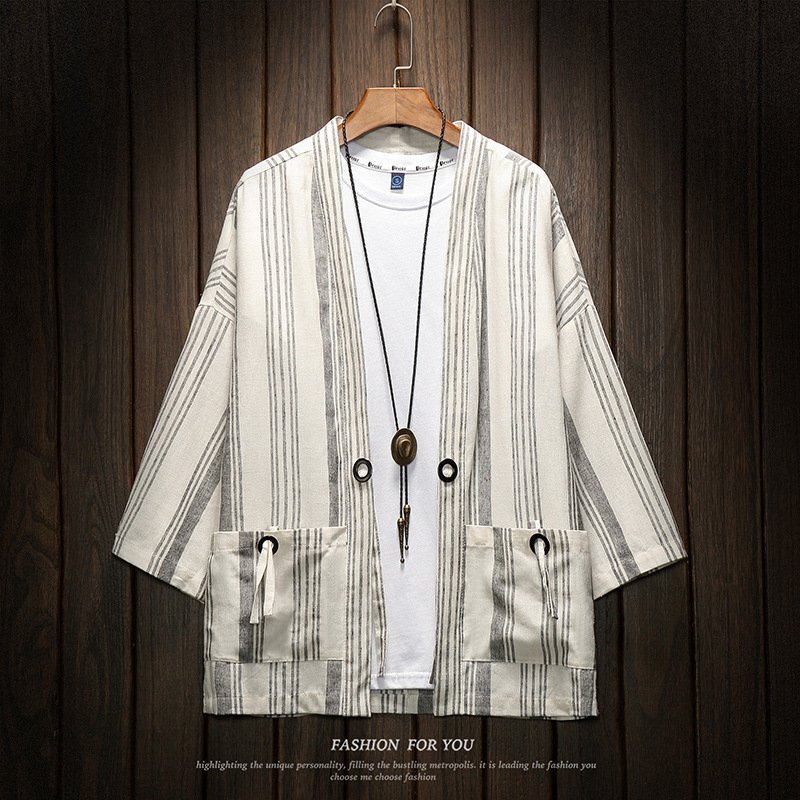 - OHJ248★上質 夏物 2色 リネン 七分袖 サマーカーディガン メンズ ストライプ柄 ショート丈 羽織 和服 夏服 トップス 半纏 半被 法被 甚平