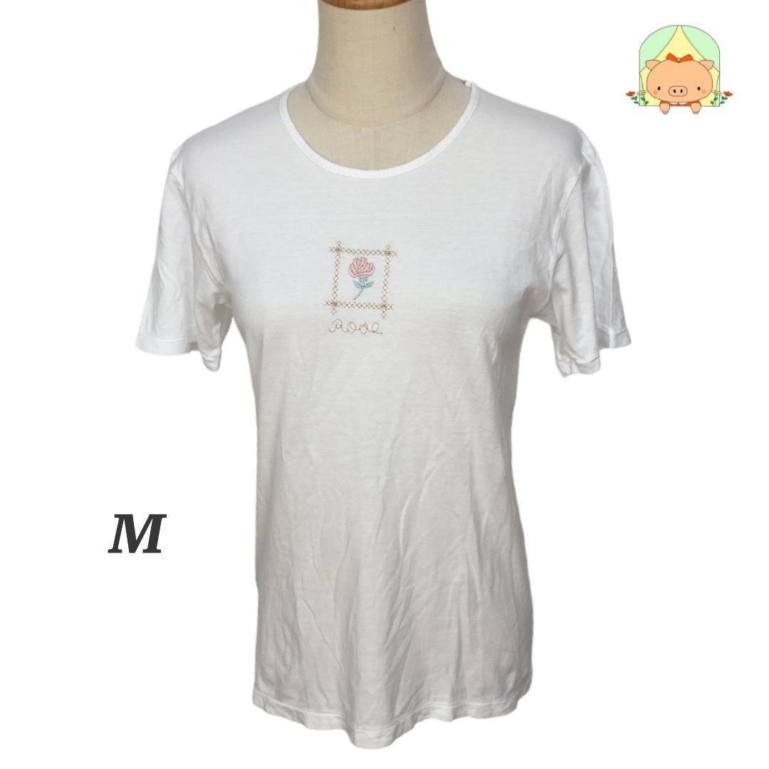> CA0275 バラ 刺繍 ワンポイント ラウンドネック 薄手 コットン100% Tシャツ 【M】