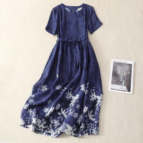 - OHJ308★人気 夏新品 カジュアル ワンピース レディース 体型カバー 花柄 綿麻リボン 半袖 ロングワンピースブルーL サイズ選択可