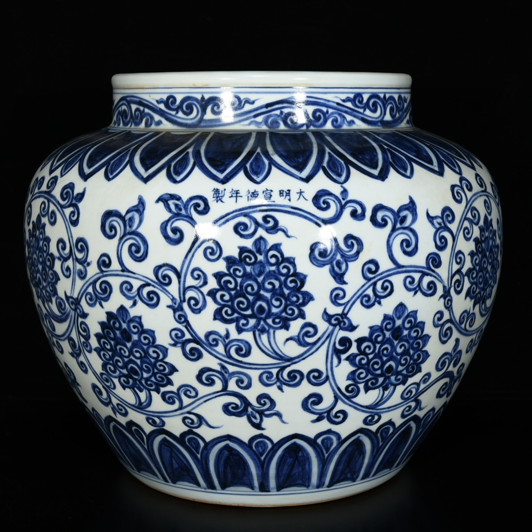 - ◆蔵出◆古美術 中国古玩 大明宣徳年製款 青花 纏枝蓮 牡丹花卉紋大罐 時代物 AT08