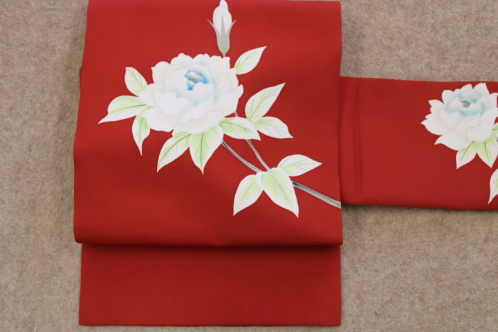 > きもの今昔7825 名古屋帯 正絹塩瀬羽二重染帯 手描き赤色地シャクヤクの花柄 画像①の色が近い