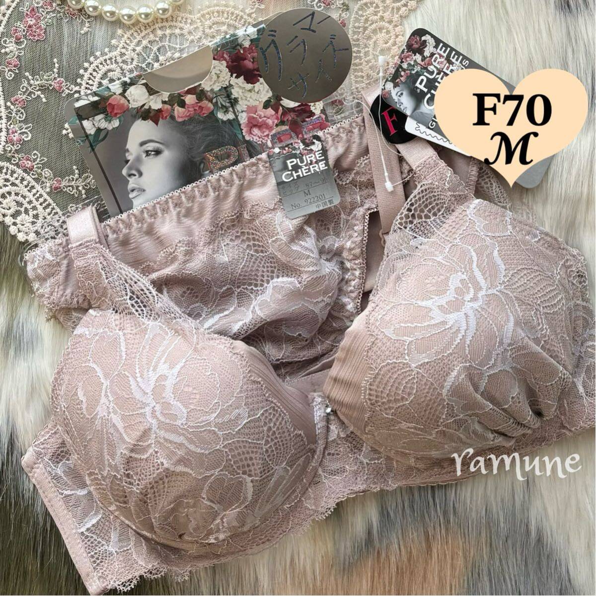 - 【F70-M ベージュ 上下セット】新品 ブラ&ショーツ ブラジャーショーツセット 下厚パッド内蔵 立体カップ グラマー レースパンティ Fカップ