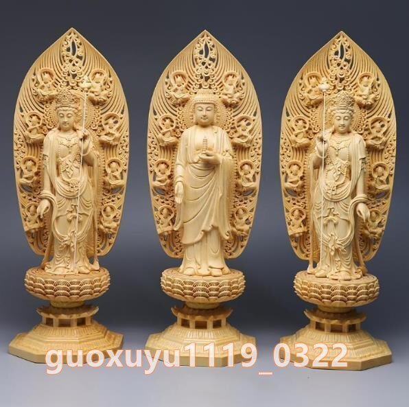 - 新作 阿弥陀如来三尊立像 仏教美術 精密彫刻 仏像 手彫り 高さ約43cm