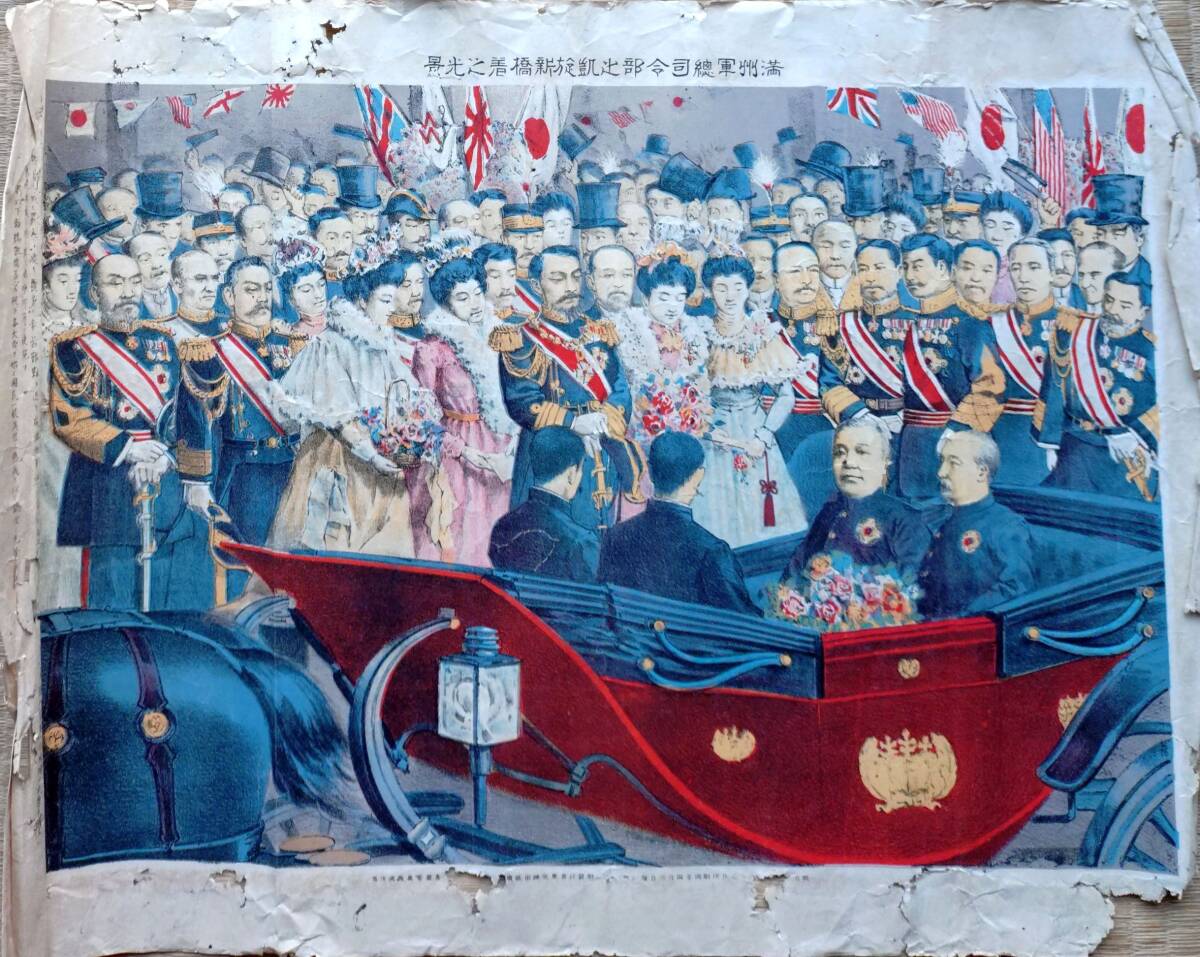 - f24110855〇一枚摺物 刷物 彩色石版画 満州軍総司令部凱旋新橋着の光景 明治39年〇和本古書古文書