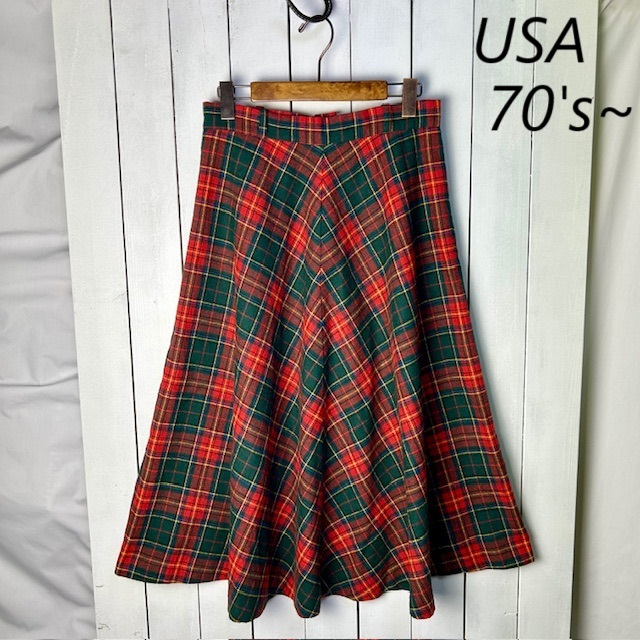 > USA古着 70s~ USA製 柄合わせ タータンチェック ウールフレアスカート 13-14 赤×緑 オールド ヴィンテージ ロングスカート M~L ●376