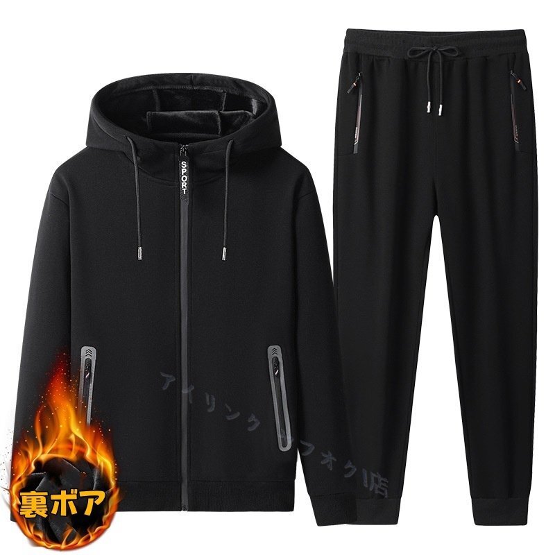 > ☆新品 ジップアップ メンズ フードジャケット ジョガーパンツ 上下セット 裏ボア冬服スウェット パーカー パンツ クロ 6XL