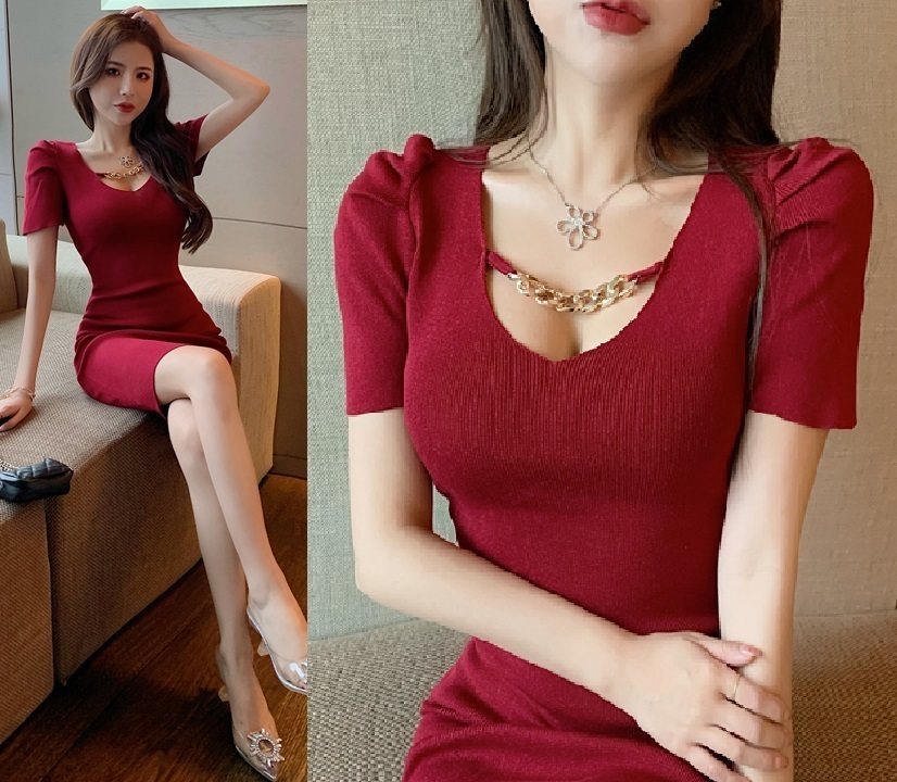 - 新品【魅惑Style】セクシー♪ゴールドチェーン付*Vネック*ニット素材*タイトワンピース*赤*ボルドー*伸縮性有り DJ811