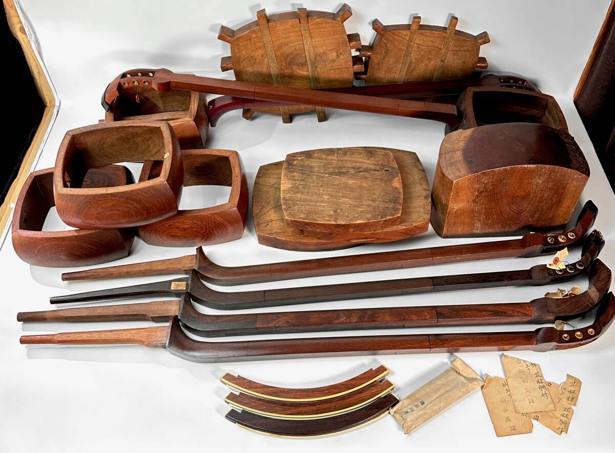 - 地元で名を馳せた三味線職人の居た明治期創業、由緒ある楽器店の放出品! 三味線 材料 部品 まとめて 大量セット 棹 胴 検:花梨 紫檀 紅木