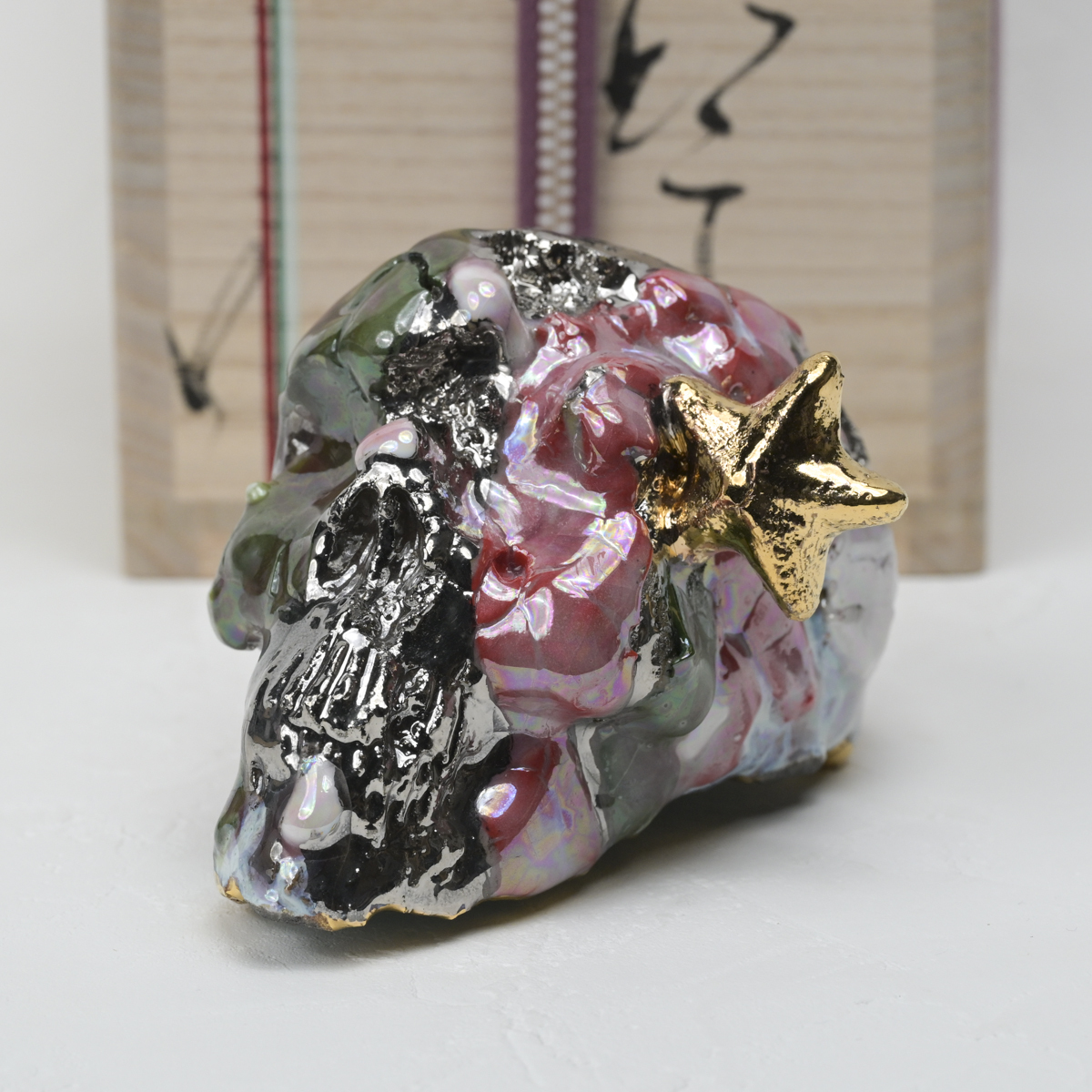 メメントモリシリーズのドクロのフォルムに、金属光沢の銀色、渋い緑とビビッドなピンクにアイスブルー、オパールのように虹色に輝く釉薬を組み合わせ、更にそこに金色に光る星をあしらうという、作家の魅力が集約している作品です。