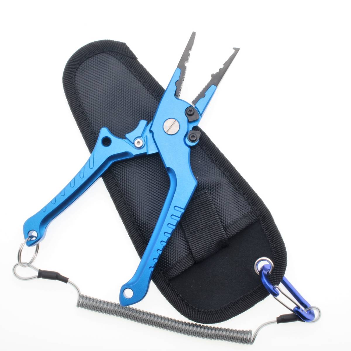 - 【送料無料】ロック付き 軽量アルミ製 フィッシングプライヤー ブルー ロングノーズ PEラインカッター 多機能 釣りペンチ 針外し