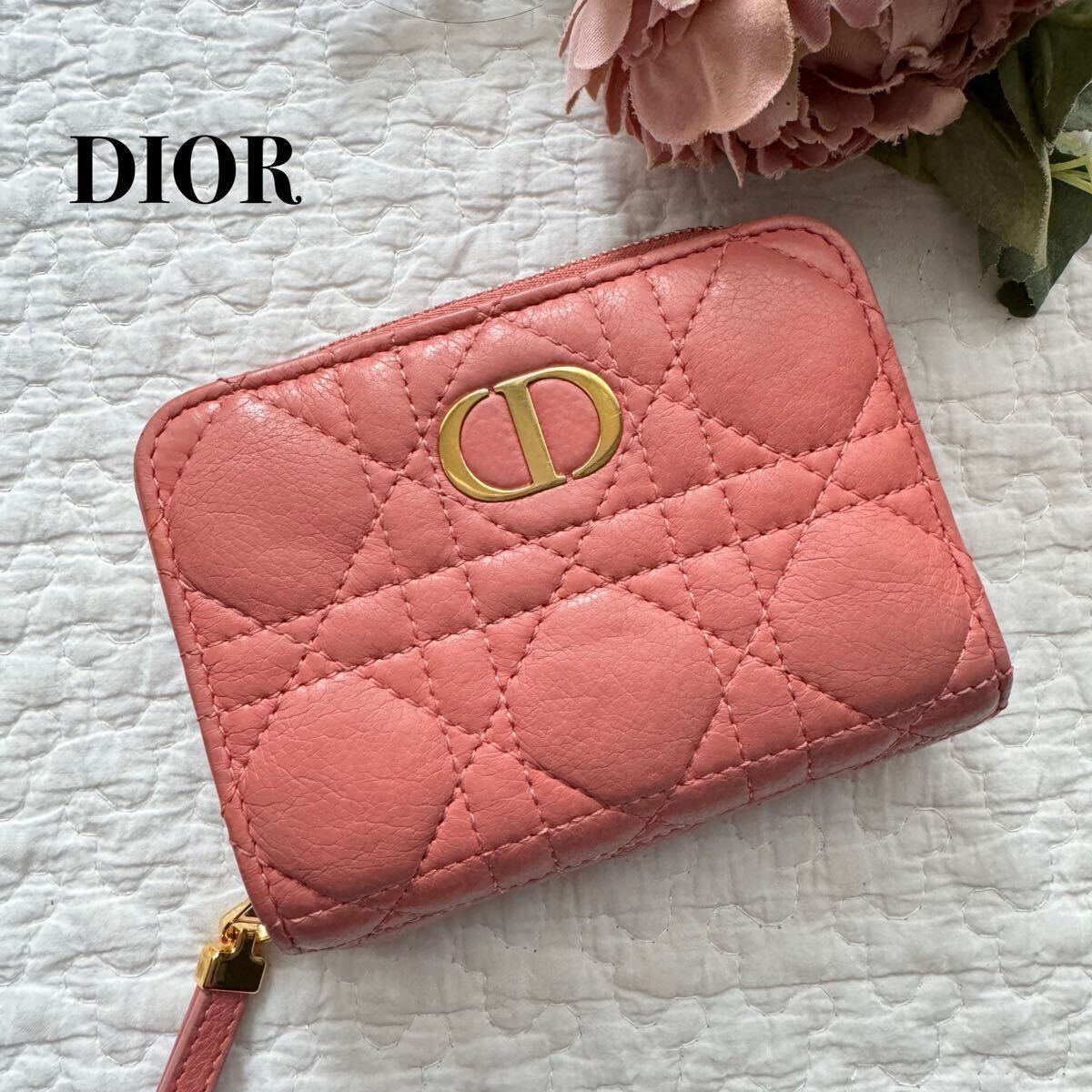 > 極美品ChristianDior クリスチャンディオール カロ ジップウォレット カナージュ CDロゴ 二つ折り財布 ラムスキン ピンク