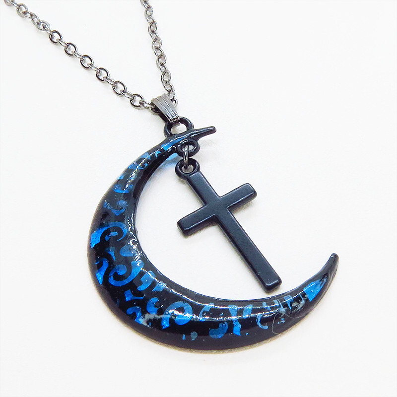 - ゴシック調ブルーブラックムーンネックレス ロザリオ ブラック(ガンメタル)チェーン 長さ調整可