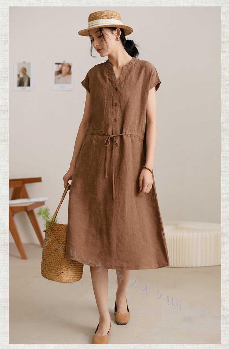 > 新品亜麻100% ロングワンピース 無地 半袖 レディース 着痩せ 体型カバー ゆったり ロング丈 30代 40代 通勤 涼しい L ブラウン