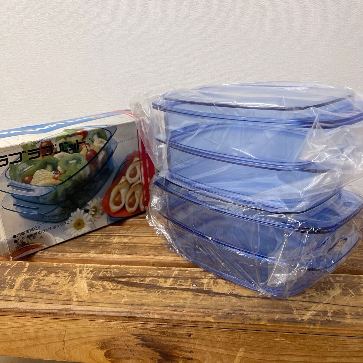 > 昭和レトロ プラスチック製保存容器 お弁当箱 冷蔵庫収納 未使用/デッドストック品 青 クリアカラー 管T-86