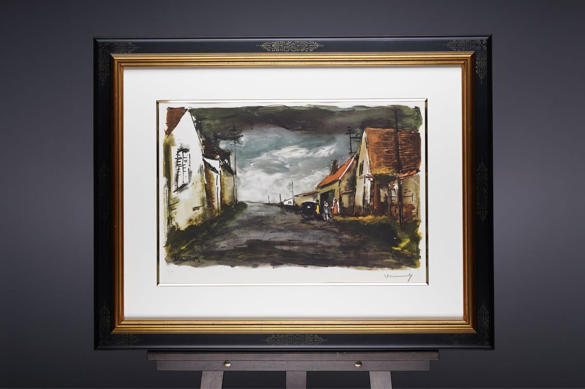 > 真作 モーリス・ド・ヴラマンク Maurice de Vlaminck「村の道」リトグラフ 画寸(53.5x36.5cm) 本人サインあり 高級額縁付 検索用:佐伯祐三