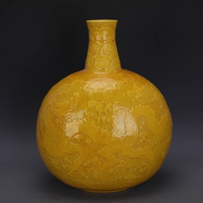 > ◆旧家蔵出◆ 古美術 中国古玩 大明永樂年製款 黄釉 雕刻 龍紋扁瓶 擺件 古賞物 骨董 時代物 CN01