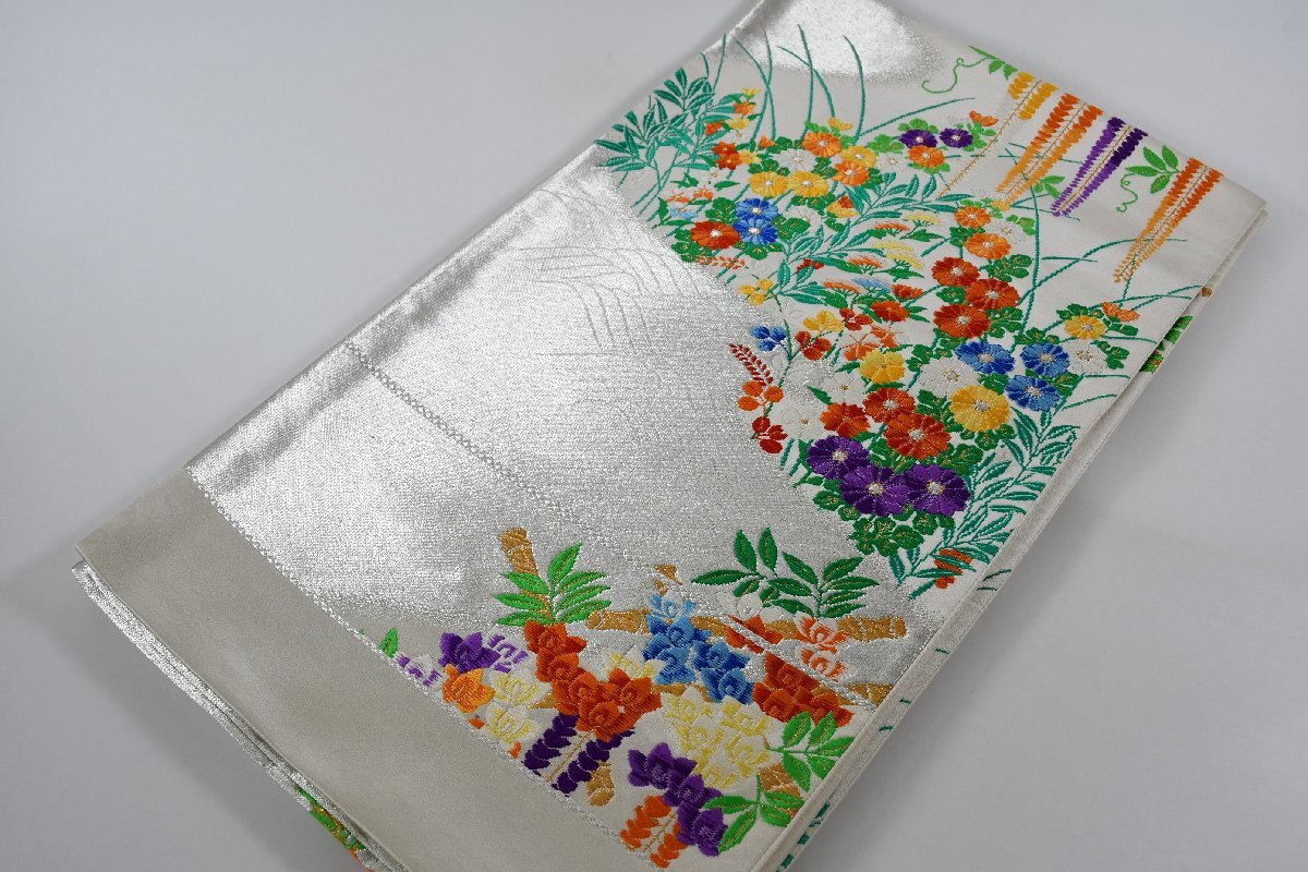 > 袋帯 未仕立て 六通柄 銀糸 秋草 西陣 帯丈434cm ★着物屋 ne-13322 桜庭呉服店