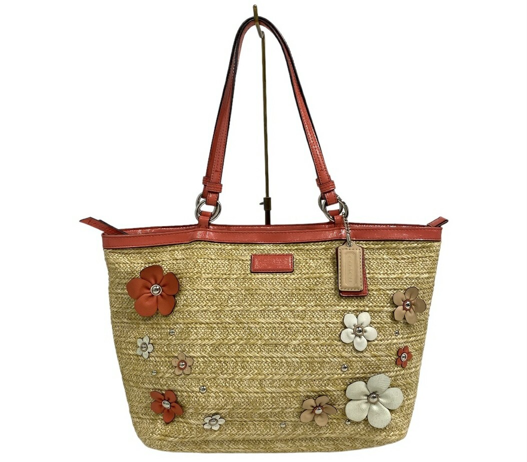 - 【外観美品 訳あり】 COACH コーチ レザー フラワーモチーフ カゴバッグ トートバッグ ストローバッグ 24ふ304