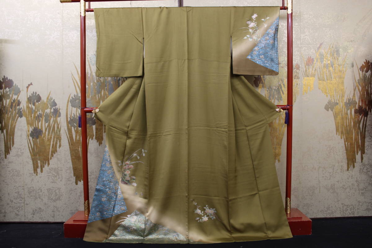 > きもの今昔5118 附下訪問着 正絹梨地綸子広衿袷手縫い仕立て 青銅箔摺り加工に螺鈿入り 身丈169cm