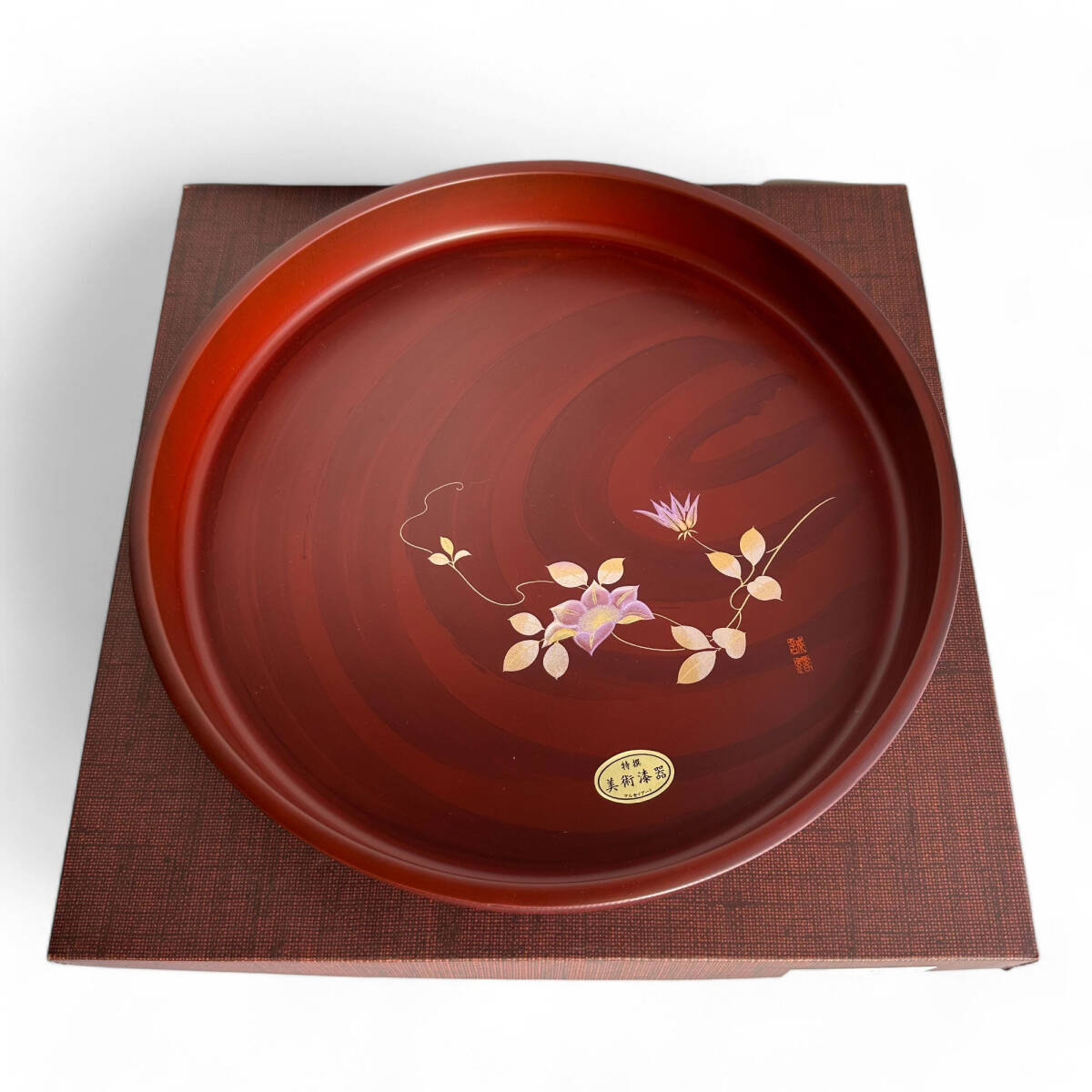 - N2301 未使用 木目紀の里 特製 美術漆器 丸盆 30cm おぼん 漆